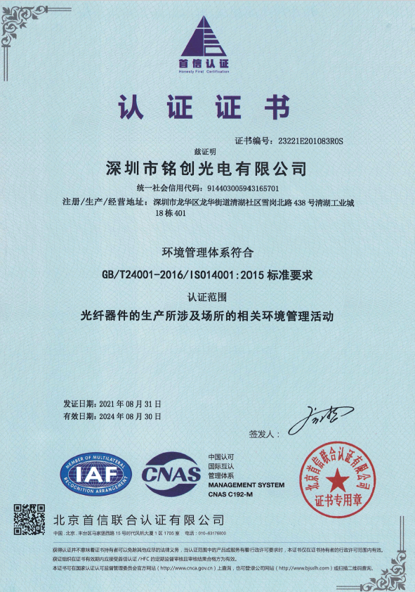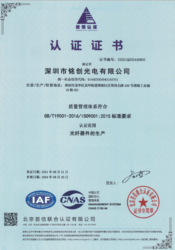 深圳市銘創(chuàng)光電有限公司于2012年成立,公司總部位于深圳市光明區(qū),是一家國(guó)家級(jí)高新技術(shù)企業(yè),通過了IS09001-2015質(zhì)量管理體系認(rèn)證和IS014001-2015環(huán)境管理體系認(rèn)證;經(jīng)過多年的持續(xù)研發(fā)投入和專注發(fā)展,銘創(chuàng)光電已逐漸成為光纖激光器、光纖傳感、激光雷達(dá)和激光通信等領(lǐng)域的綜合性產(chǎn)品服務(wù)商。 公司目前設(shè)立有光無源器件研發(fā)生產(chǎn)中心和激光研發(fā)生產(chǎn)中心。無源器件研發(fā)生產(chǎn)中心設(shè)有有高標(biāo)準(zhǔn)的無塵車間,可提供各種波長(zhǎng)的無源光纖器件、高功率光纖器件、保偏光纖產(chǎn)品、超小型光纖器件。激光研發(fā)中心建立在安徽合肥市,研發(fā)生產(chǎn)特殊波長(zhǎng)的激光光源、光纖激光器、光纖放大器以及新產(chǎn)品的技術(shù)研究?jī)?chǔ)備。研發(fā)生產(chǎn)中心與多地科研單位合作,能夠迅捷高效的為客戶提供相